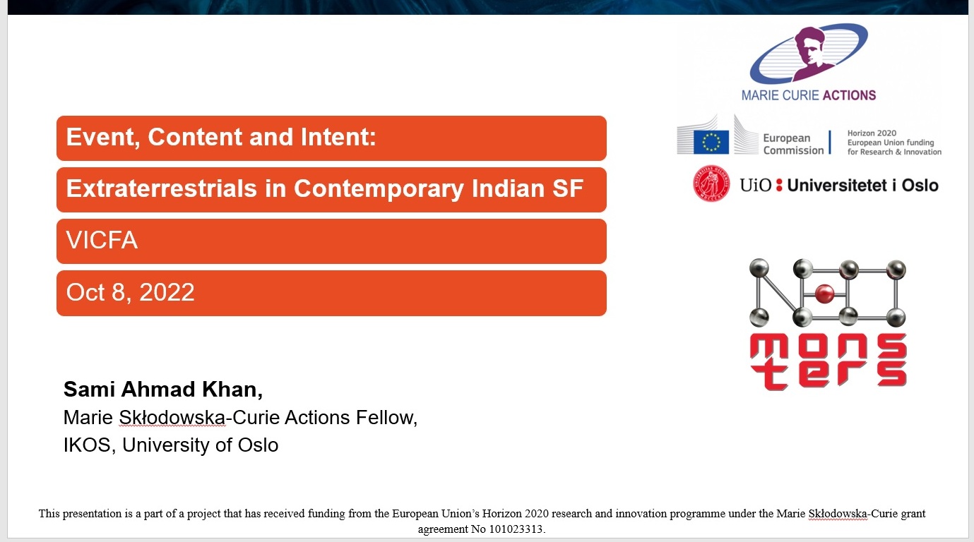 1. VICFA22: Presented a paper “Event, Content and Intent: Extraterrestrials in Contemporary Indian SF” at Virtual International Conference for the Fantastic in the Arts, USA (October 7–9, 2022).