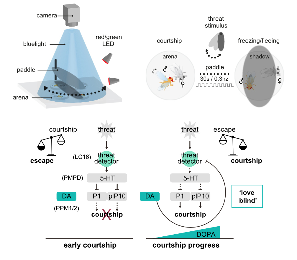 - Neurochemical Mechanisms: The role of serotonin (5-HT) and dopamine was central to the project. Serotonin was shown to inhibit courtship when a threat was present by acting through 5-HT receptors in specific courtship neurons, including the P1 cluster and plP10 neurons. Dopamine, on the other hand, was found to influence how flies prioritize reproduction as they progress through courtship.