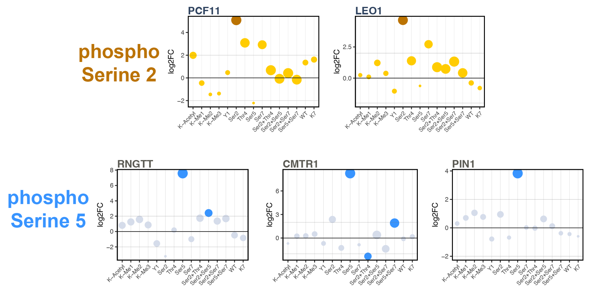 Within the scope of the first aim, we developed the most comprehensive protein-interactome of RNAPII to date, relying on the synthesis of over 30 different peptides displaying key permutations of phosphorylated aminoacids and proline isomeric states. Importantly, this was only possible due to the collaboration with the mass spectrometry facility within the host institution, which allowed for the use of automated liquid handling robots to perform the necessary key steps in our protocol. This automation allowed for a high-quality dataset, spanning known key RNAPII binders but identifying over 50 new specific binders. We also identified several proteins that uniquely bind to CIS-containing substrates that are missing from the TRANS-dataset, thus achieving the goal of this aim.
