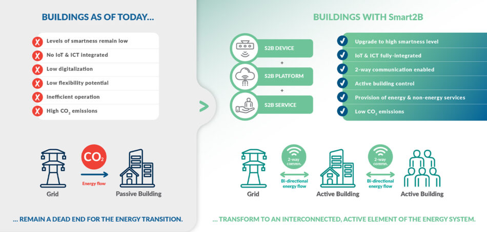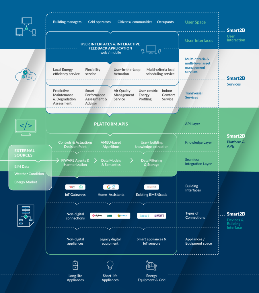 The smart building system conceived within the Smart2B project consists of: devices, which will allow the seamless connection of heterogeneous building energy systems, including not-yet-connected devices and legacy appliances; a platform, that serves as the middle layer of the system that enables integration, knowledge extraction and control; services, which are tools based on AI and machine learning algorithms that can be used to analyze and prepare the building and user data collected from the devices, consolidating and optimizing the various Smart2B objectives.