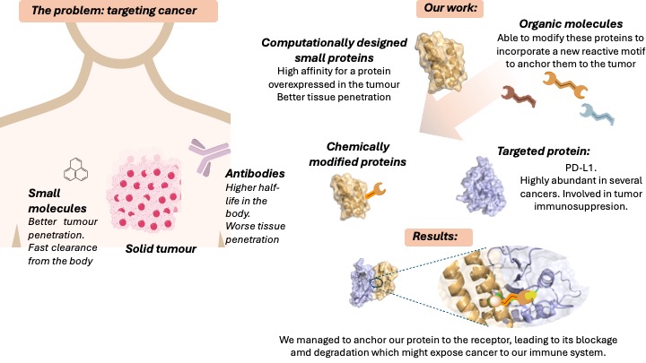 That way, we created a library of 40 new minibinders with different affinities to PD-L1, and we selected those able to stablish a covalent interaction with that receptor. From those, we selected the fastest one to study it in vitro. Preliminary results obtained in collaboration with the Instituto de Medicina Molecular (IMM) from Lisbon, suggest that this new minibinder not only establishes a covalent interaction with PD-L1 on cell surface, but also induces its degradation.