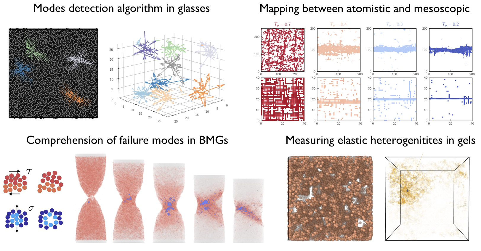 The elasto-plastic deformation of amorphous solids, glasses in particular, and their modes of failure, remain major challenges in mechanics and materials science, with far reaching fundamental and practical implications. At the fundamental level, the irreversible and failure dynamics of glasses pose deep questions about disordered, out-of-equilibrium, driven dissipative systems. Our understanding of failure pathways remains very incomplete and in particular, lags behind our understanding of the corresponding processes in the ordered counterparts of glasses, i.e. in crystalline solids. This research proposal aims to better understand the connection between amorphous microstructures and material resistance to failure. Main research objectives of this action are: (i) building a novel algorithm to detect the field of plastic instabilities in structural glasses, (ii) understanding the nonlinear micromechanics of glassy defects and extracting microscopic flow rules from glassy samples, and (iii) coupling particle based simulations and mesoscopic elasto-plastic models to study strain localization and fracture. Overall, this project has led to the development of new cutting edge microscopic tools that help us to characterize structural and mechanical heterogeneities in structural glasses. We have shown that one can firmly establish a link between microstructures and glassy defects. Furthermore, we have demonstrated that one can extract local flow rules from as-cast glassy samples. The latter opens new avenues including: (i) the systematic and efficient characterization of a large catalog of glasses with different chemical compositions and material preparation histories and (ii) the calibration of mesoscopic models of plasticity to study large scale dissipative collective phenomena, such as the nucleation of shear bands.