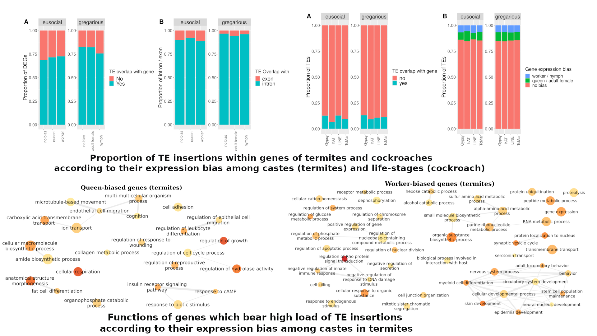 In order to unravel the role of transposons, along with their evolutionary dynamics with host piRNAs, in the emergence of novel phenotypes, TEEPI focus on the evolution of the insect order Blattodea, which encompasses cockroaches and termites. Those insects were chosen as model system, since they have repeatedly evolved complex phenotypes, such as eusociality in termites (a Major Evolutionary Transition and the highest level of sociality) and wood feeding. Furthermore, only few blattodean species have been sequenced so far (3 cockroach and 6 termite species) and demonstrates that a large part of their genome is made up of transposons. This enhances the potential of TEEPI to bring groundbreaking results and to rely mostly on genomes obtained with long-read sequencing technology, hence allowing a precise categorization of transposons and piRNAs. In addition, several cockroach and termite species are common pests and responsible for billion of euros of damages to human societies, which warrant the need of a better characterization of their resilience and biology at the molecular level to efficiently manage them without hindering other valuable insect species. More precisely, TEEPI focus on the categorization and mapping of transposons and piRNAs within blattodean genomes, to unravel their role during termite eusocial transition.