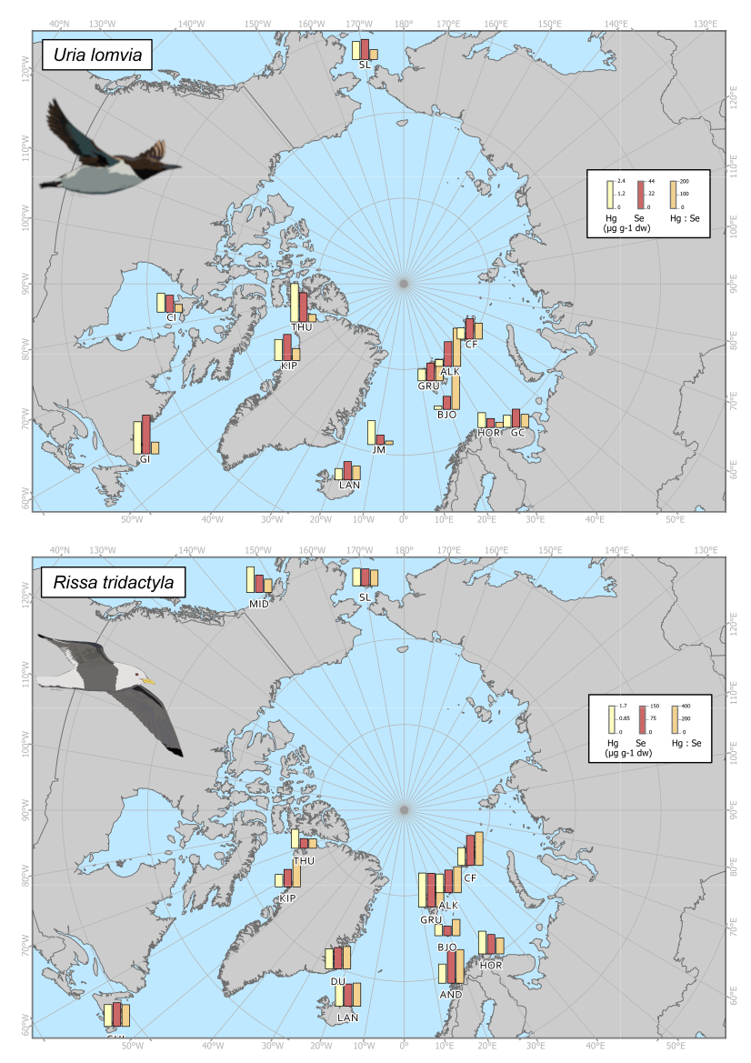 In a second contribution, the effects of multiple environmental stressors (Se, Hg, and environmental conditions) have been evaluated on a keystone Arctic seabird demography, the little auk from East Greenland. Hg and Se concentrations have no significant effect on little auk survival. However, we found that environmental conditions had a major influence on survival. The anomaly in sea surface temperature during the breeding season is the variable with the greatest influence on the survival of little auks: an increase in SSTA during the breeding at Year t-3 will produce a reduction of the survival at Year t+1, most likely due to a cascade effect through the food chain. However, we found a positive effect on survival at Year t+1 when the SSTA of the moulting area at Year t increases, most likely due to a benefit in the short term, since little auks would need to travel less to feed, as sea ice covering would be reduced due to the increase in temperature, increasing the availability of prey close to the colony. This study will be among the first initiatives to thoroughly address the effect of different pollutants on the survival of wild animal populations in a multi-stress context.