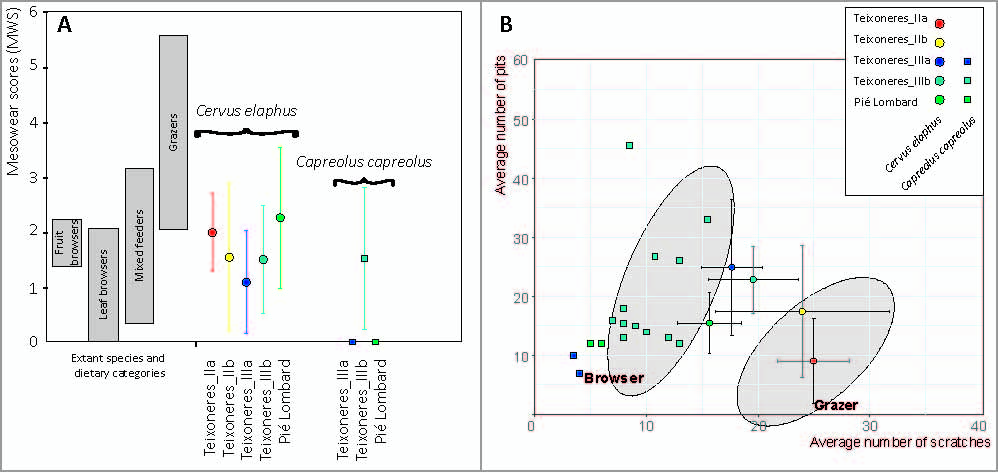 The second objective was the improvement of local environment studies through the integration of several proxies. Dental meso- and microwear are proxies that allow the diet to be reconstituted. Applied to herbivores, these proxies provide information on vegetation structure and composition. Several studies on fossil populations have proposed environmental reconstructions based on these methods. These studies often focus on a few selected taxa and rarely consider the total variability of ungulate diets at sites in contexts where the seasonality of occupations is often not estimated. These data can greatly improve the quality and resolution of the interpretation. In this manuscript submitted to JAS: Report, we propose a new approach to dental wear to reconstruct environments. We recommend including all available ungulates to consider as many habitats as possible. The combination of dental meso- and microwear allows us to address two scales of time and space – the regional scale over several years and the local scale over one season, respectively. Applied to Teixoneres Cave and Pié Lombard, the results confirm previous microfauna analysis and make it possible to characterize the intensity of seasonal turnover. This study marks a step in dental wear analysis by giving a more precise frame of both dental meso-/ and microwear and presenting a robust paythway for paleoenvironmental reconstruction. The publication process is still ongoing with the manuscript being currently under review.