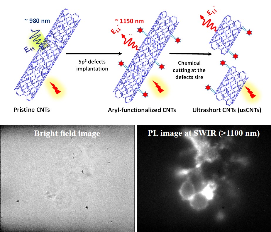 The implications of this novel work in understanding the accessibility of tissue environment by the usCNTs is significant. Changing the length of SWCNTs in addition to the sp3 defects opens the route for the investigation on physiological and pathological questions such as the diagnosis of cancer by fully using the near-infrared transparency window of biological tissue (e.g. biopsies). We can also envisage other applications such as the study of brain tissue structures in the context of neurodegenerative diseases like Alzheimer, Parkinson and Huntington diseases.
