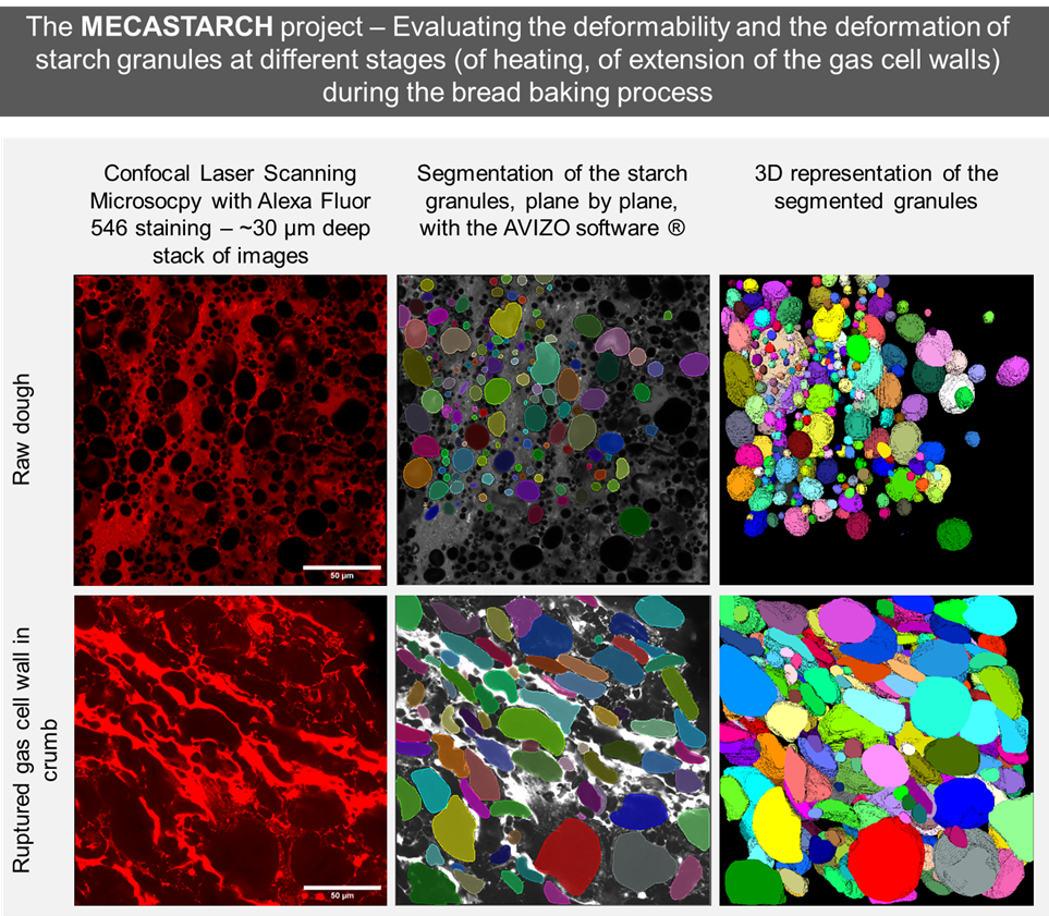 Based on this context, specific objectives were established. As a first step, starches likely to soften to a different extent upon heating in excess of water were collected, characterized and selected, and their mechanical properties upon heating and controlled hydration levels were acquired, to better understand their softening during bread baking. Then, the organization and morphology (deformation) of wheat starch granules in the gas cell walls were illustrated through different microscopic techniques (CLSM and NLOM), focusing on the proving and baking stages (dough and crumb).
