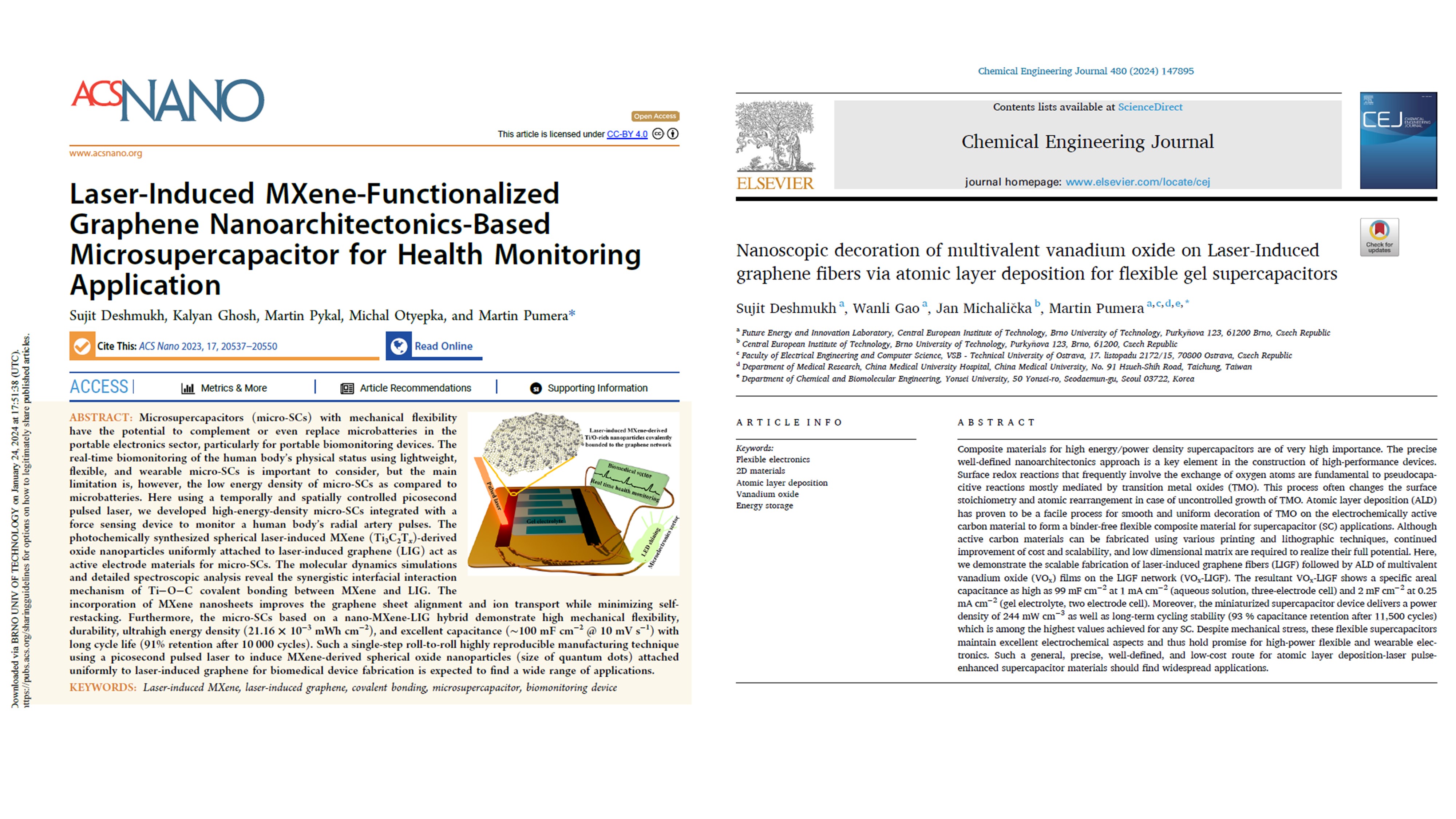 1) In one project, we utilized a precisely controlled picosecond pulsed laser to develop micro-supercapacitors (micro-SCs) integrated with a force sensing device for monitoring radial artery pulses. These micro-SCs, employing spherical laser-induced MXene-derived oxide nanoparticles on laser-induced graphene (LIG), demonstrated exceptional energy density, mechanical flexibility, and capacitance, showcasing potential for biomedical device fabrication.