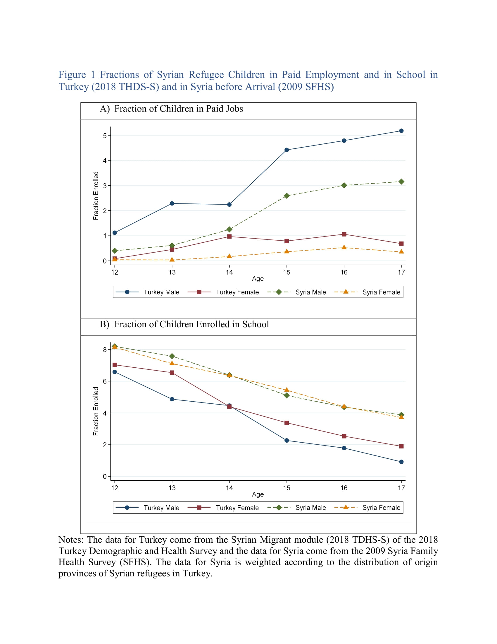 Our work on the school integration of refugee children shows that accounting for a rich set of socioeconomic variables, the native–refugee gap in school enrollment drops by half for boys and two-thirds for girls, but the gap persists for both genders. When we restrict the sample to refugees who arrived in Turkey at or before age eight and account for socioeconomic differences, the native–refugee gap completely vanishes for both boys and girls, indicating that school integration of refugee children in Turkey has been possible conditional on their age at arrival. We also find that the timing of boys’ school dropouts coincides with their entry into the labor market, whereas girls’ dropouts mostly occur before marriage age. Finally, we reveal important differences between natives and refugees in never starting school, grade progression and repetition, dropping out, and grade for age.