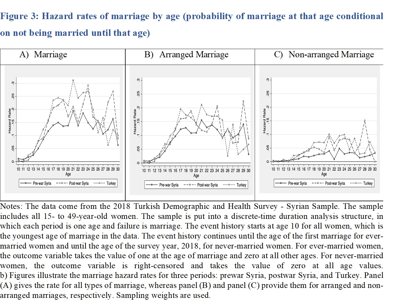 The experience of war and refugee status can alter intra-family dynamics and, therefore, have implications for family formation, including marriage. We find that early marriage is more prominent among refugees who were unmarried at the time of migration than those married before migration; the mean marriage age drops from 19.6 in prewar Syria to 19.1 in postwar Syria and 18.1 in Turkey. We show that this finding aligns with the observed declines in household income and young women’s opportunity cost of marriage. Our analysis also reveals a notable shift from traditional arranged marriages to more modern forms among refugees in Turkey. An intergenerational power shift may drive the shift toward non-arranged marriages. After arrival in Turkey, parental wealth and employment decline. In contrast, Syrian youth have higher age-adjusted employment rates than in prewar Syria. Moreover, for demographic groups with stronger intergenerational power shifts, non-arranged marriages increase more.