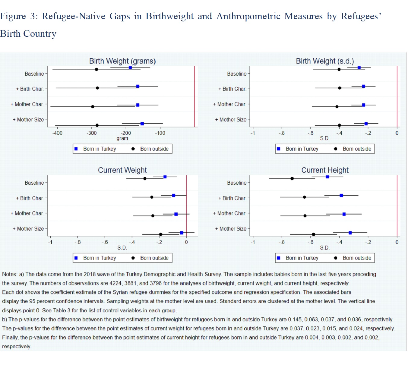 Our findings on the differences between native and Syrian-refugee children in birthweight and anthropometric outcomes show that after controlling for a rich set of birth and socioeconomic characteristics that display significant variation between natives and refugees born in Turkey, refugee babies’ average birthweight and age-adjusted height are 0.17 and 0.23 standard deviations lower, respectively; however, no gap remains in their age-adjusted weight. These gaps are even larger for refugee babies born outside Turkey. The differences in birthweight and anthropometric outcomes are limited to the lower end of the distribution. After accounting for the covariates, refugee babies born in Turkey are 4.8 percentage points more likely to have low birthweight, 2.4 percentage points more likely to be underweight, and 6.0 percentage points more likely to be stunted. However, no native-refugee gap exists above the mean level for any outcomes.