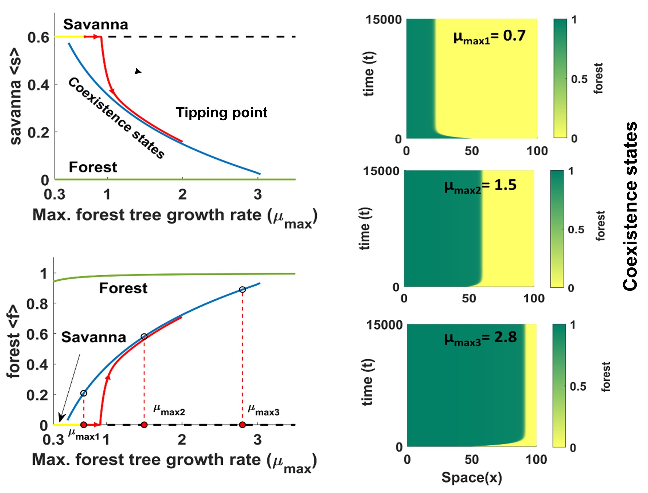 In this project, the different mechanisms of pattern formation in the savannas were studied. Results showed that while the well-studied Turing patterns can be seen in the water-limited region, these cannot be observed at the humid savanna-forest boundary. At the humid savannas, environmental spatial heterogeneity plays an important role in pattern formation. Disturbances like grazing and deforestation can form stable savanna-forest patterns in the presence of such heterogeneity. In that case, changing climatic conditions may not lead to tipping of one ecosystem state to another. Instead, a part of the system may collapse to produce stable savanna-forest patterns which we refer to as coexistence states. These coexistence states can adapt gradually to changing climatic conditions and can exist much beyond the tipping point thus making the ecosystems more resilient. This forces us to rethink ecosystem response to climate change and indicates the important role played by spatial processes in ecosystems. In the mesic savannas, where rainfall is in the intermediate ranges, results showed that fire is key to formation of Turing patterns which may also increase resilience of the ecosystem. These results from the project have been disseminated through scientific manuscript and presentations in scientific conferences. The findings have also been communicated to the general public using a project website and a news article from the university which has been shared on various social media platforms.