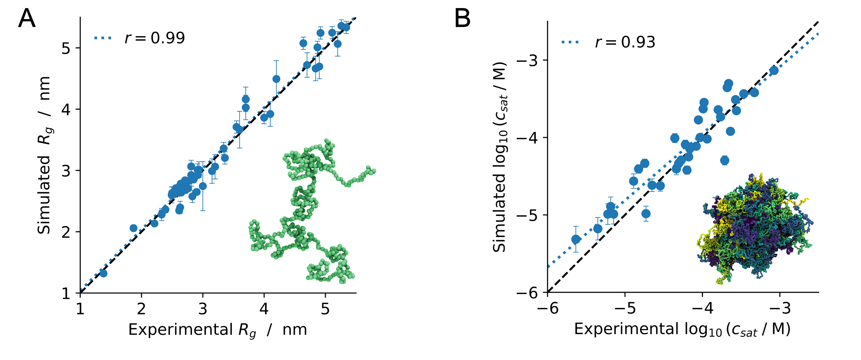 To substantiate the feasibility of this approach and guide the design of small-molecule modulators of condensate properties, we need molecular models which are able to accurately predict the influence of solution conditions and sequence variations on the preferences of IDRs to self-associate.