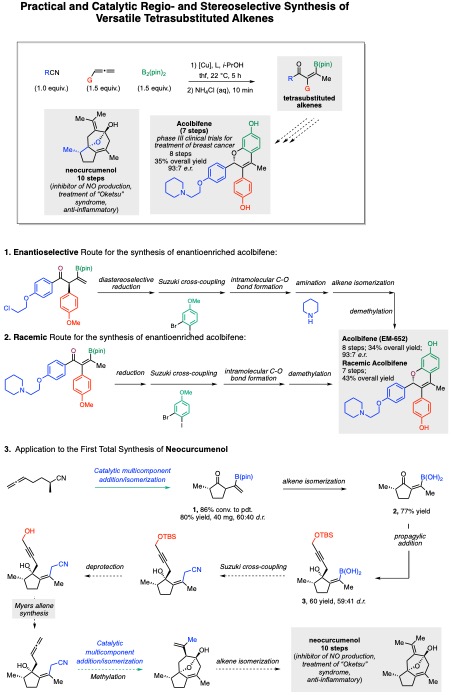 The goal of the proposed studies is to introduce a practical, scalable, modular and highly stereoselective synthesis of a large assortment tetrasubstituted alkenes from readily available Cu-based catalysts, nitriles, allenes, and a commercially available diboron compound. The tetrasubstituted alkene products will contain readily modifiable functional groups, such as a ketone (e.g. enantioselective reduction), and a boronate moiety (e.g. catalytic cross-coupling), thus offering direct access to a larger collection of otherwise difficult-to-prepare and much sought-after derivatives. The applicability of the approach will be highlighted by a concise and practical gram-scale stereoselective synthesis of two important bioactive compounds. The first will be neocurcumenol, a natural product with anti-inflammatory properties, and the second will be acolbifene, currently in third phase clinical trials for treatment of breast cancer. Equally important, the versatility of the catalytic strategy will allow for facile preparation of host of related analogues – entities that might display superior pharmacological properties and cannot be synthesized easily by the available methods.