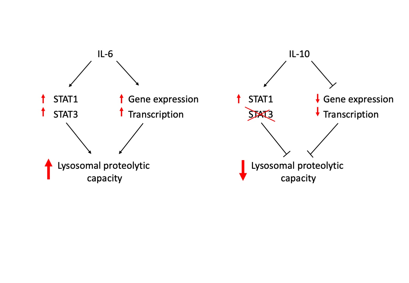CytoLysoReg implementation has served to unveil kinetic differences between the IL-6 and IL-10 signalling networks explaining the ability of IL-6 to induce the expression of lysosomal proteases, contrary to IL-10. First difference is the transient activation of STAT3 and STAT1 by IL-6 vs. persistent STAT3 activation and lack of STAT1 activation by IL-10. The second, a sustained activation of STAT3 obtained with IL-6 not elicited by IL-10. However, it falls short to explain the molecular mechanism through which IL-10 inhibits their expression. Then, our phospho-proteomics approach has allowed us to dig deeper in the differences between these two cytokines. Meanwhile, IL-6 induces the phosphorylation and activation of signalling pathways and proteins regulating transcription, gene expression and proliferation, therefore further enhancing the expression of these lysosomal proteases; IL-10 inhibits these pathways thus explaining the inhibitory effect of IL-10 on lysosomal activity. This information provides us with novel targets involved in the cytokine-mediated regulation of the lysosomal compartment, thus offering new tools to fine-tune lysosomal activity.