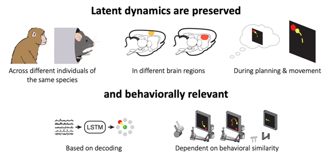 We demonstrated that animals of the same species exhibit remarkably similar neural population dynamics when performing similar behaviours, despite the individual variations in their neural circuitry. Using neural recordings from monkeys and mice engaged in upper limb tasks, we employed Principal Component Analysis (PCA) and Canonical Correlation Analysis (CCA) to uncover and subsequently align the coordinated activity of large populations of single neurons (the so-called latent dynamics). We found that these dynamics are not only preserved across individuals but are also behaviourally relevant, allowing for the decoding of intended and ongoing movements. Furthermore, these preserved dynamics extend beyond the cortex to the dorsal striatum and are present even during the planning phase of movements. We also found that the extent of preservation in neural dynamics was directly related to the stereotypy of the behaviour. Finally, we could train recurrent neural networks that produced the same behaviour with markedly different dynamics. This showed that behavioural similarity is not sufficient for observing similar neural dynamics.