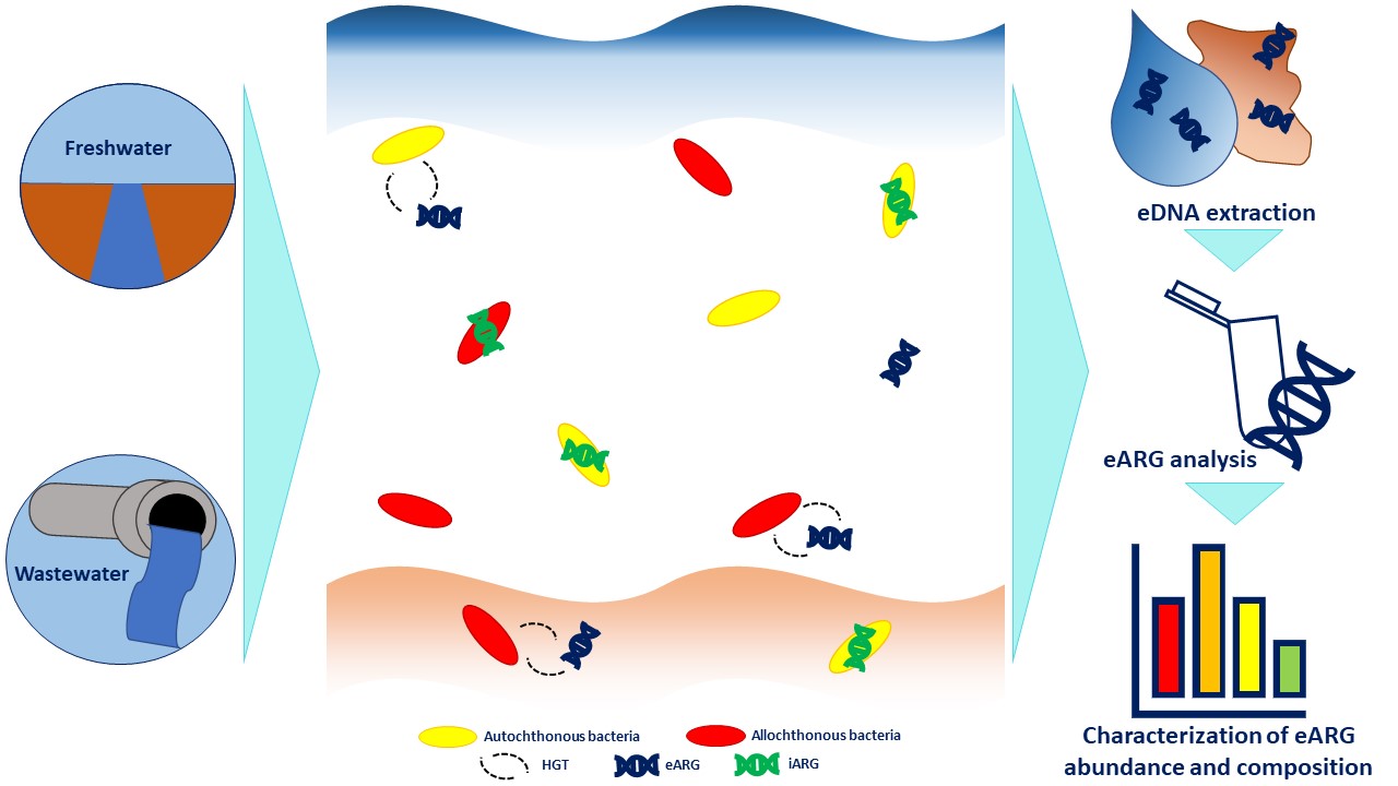 Successively, samples from different water sources, influenced by a diverse anthropogenic pollution, were collected and chemically characterized. Both DNA fractions were extracted (i.e. iDNA and eDNA) and processed by the shotgun sequencing to unveil the microbial community and associated resistome composition. The anthropogenic pollution resulted to be the main driver of the antimicrobial resistome and among the mobile genetic elements (MGEs), the plasmids were the main carriers of ARGs in both DNA fractions.