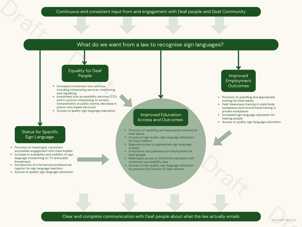 There were four main themes for what people wanted the law to guarantee which emerged in the data. First, people wanted the law to grant specific status to signed language. This was particularly true in those states where a spoken language had a specific and identifiable legal protection, such as spoke Irish in Ireland, Swedish in Finland, Welsh in Wales or Gaelic in Scotland. Participants wanted the provision of meaningful, consistent and accessible engagement with state bodies, an increased availability of sign language interpreting on TV and public broadcasts, and the introduction of a formal register for sign language teaching.