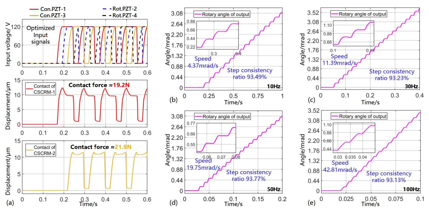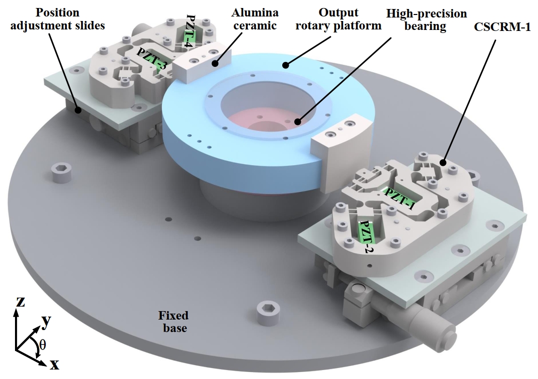 2. Inspired by the biological inchworm principle, the project designed a new cross-scale compliant rotary actuator with minimum actuation redundancy properties, thus achieving sub-µrad level angular resolution (0.05 µrad) and wide rotation range simultaneously (±5°).