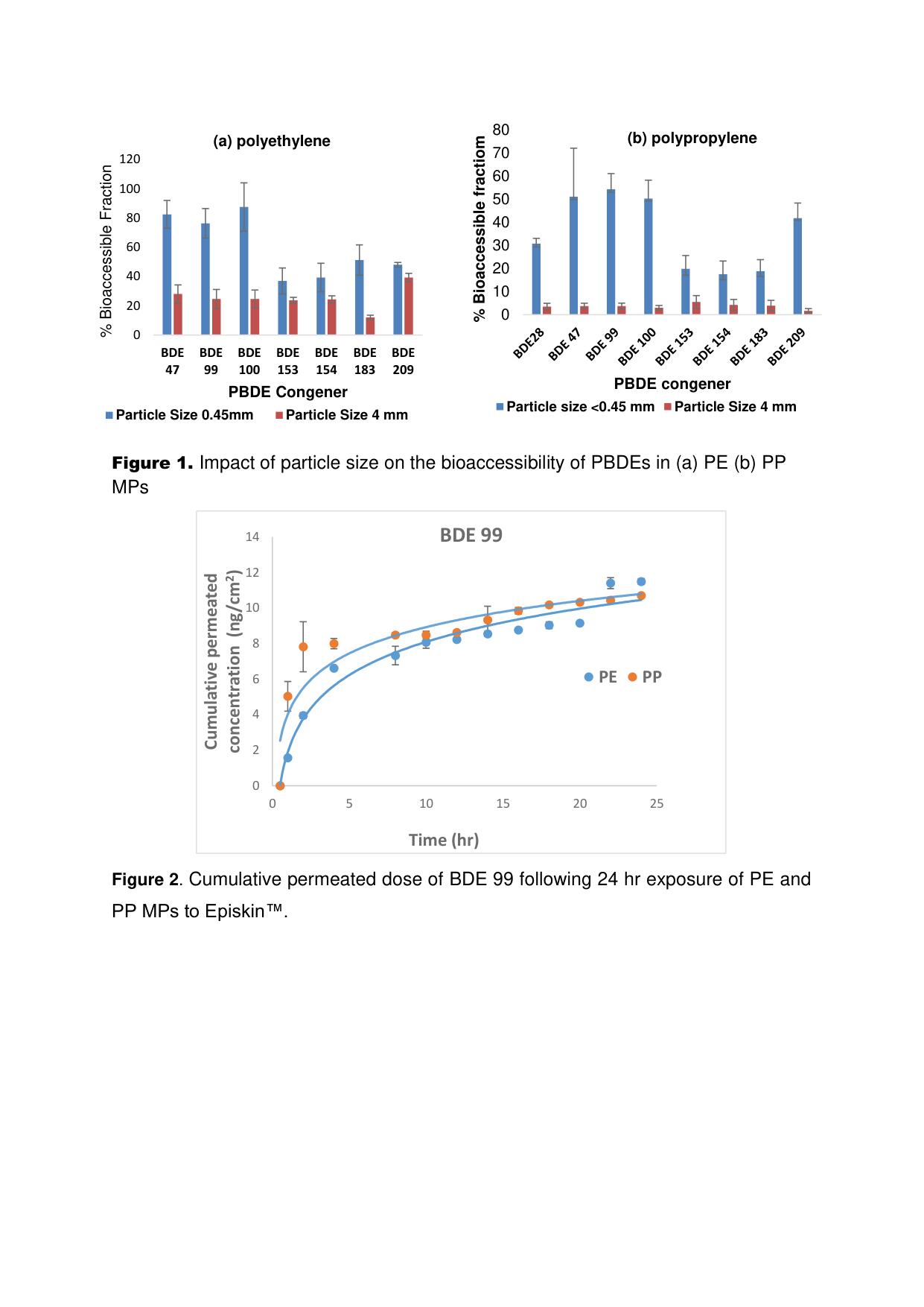 DermPlast showed, for the first time, that BFRs e.g. PBDEs and HBCDDs leached from MPs into in vitro human skin surface film liquid (SSFL) and reported the fbioaccessible of PBDEs to range from 37 – 82 % and 17 – 54%, respectively for PE and PP MPs (Fig 1). The fbioaccessible of PBDEs were influenced by the particle size of MPs with MPs of particle size <4 mm and 0.45 mm fractions differing significantly (p < 0.05) in both the PE and PP MP particles, with PE presenting more bioaccessible fractions of PBDEs compared to PP MPs. Under the most physiologically relevant SSFL composition (1:1 sweat: sebum), the fbioaccessible of HBCDDs from PS MPs were 1.6 1.8 and 2.0 %, respectively for the α, β and γ-HBCDD isomers. We found the bioaccessibility of HBCDDs to be strongly correlated with their Log KOW, suggesting the influence of sebum on the release of HBCDDs from polystyrene MPs upon contact with the skin surface. We further employed the bioaccessible fractions of BFRs to estimate the worse-case human exposure to these flame retardants and found that pentaBDE congeners (BDE-47 and 99) and BDE-209 were the main contributors to the total exposure to PBDEs arising from dermal contact with PE and PP MPs. The daily exposure dose (DEDs) of PBDEs were lower than the US EPA reference doses (RfD) for penta-, octa- and deca-BDEs, respectively. While for exposure to PS MPs, the DED of HBCDD via dermal uptake from MPs, exceeded the lifetime average daily dose through direct skin contact with flame retarded curtains containing HBCDD.