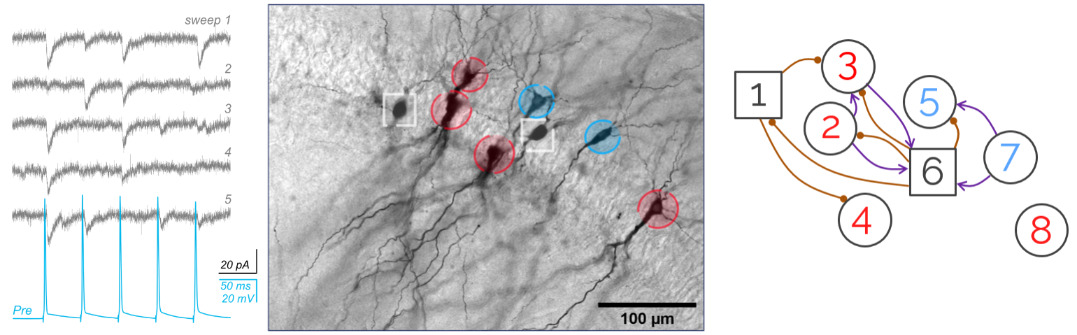 Here, we aim to determine the arrangement and properties of connections between neurons in the CA3 area of the hippocampus, a critical brain area for memory storage. Neurons have diverse cell types, meaning that the properties of cells and networks are highly heterogeneous, adding complexity to both the brain’s processing and our investigation. By recording the properties of multiple individual neurons at high resolution simultaneously, we determine ‘wiring rules’ for this brain area at the level of single cells. We aimed to use this approach to understand the basic processing units of the hippocampus, so we can begin to understand how activity flows through this brain area, and how this information flow can give rise to learning and memory.