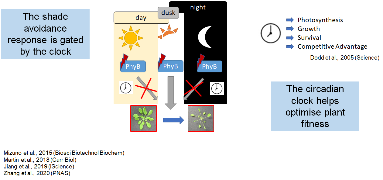 Several lines of research indicate that the shade signal is only perceived by plants at dusk, through a mechanism known as ‘gating’. Gating is controlled by the plant’s internal clock – namely the circadian clock. This endogenous timing mechanism allows a plant to fine-tune its physiology to a cyclical environment. Furthermore, proper internal timing that matches the environment is beneficial for plants and leads to optimised fitness and survival. However, almost nothing is known about how gating affects SAS plant fitness. Our data indicate that disruption of different elements that make up the clock results in plants that have an architecture very similar to SAS-affected plants. Furthermore, as the clock has been tied to the cell cycle, this suggests a possible mechanism through which the clock could be directly controlling the SAS leaf cellular response. Additionally, using a powerful bioinformatics approach we discovered an unexpected and potentially new avenue through which the clock and the phytochrome photoreceptors could be coordinately regulating leaf size, ultimately impacting biomass (a key predictor of crop yield).