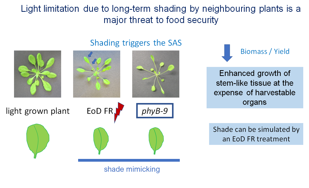 Light limitation due to long-term shading by neighbouring plants is a major threat to food security, as it decreases overall yield. At high vegetation densities, shade-intolerant plants switch to a survival growth strategy known as the shade avoidance syndrome (SAS), which reconfigures overall architecture for optimal light capture. Of the diverse light-sensing photoreceptors that plants possess, phytochrome photoreceptors are exquisitely tuned to detect spectral changes indicative of nearby vegetation. These changes in light quality activate the phytochrome surveillance system, which in turn initiates compensatory changes in plant architecture and reproductive timing to suit more crowded conditions. Plants exhibiting SAS are characterised by elongation of growth of stem-like tissue, at the expense of harvestable organs (leaves, fruits, seeds, etc.). In nature, the SAS response is critical for plant survival, but it is troublesome for farmers, as it impacts crop robustness and yield. Interestingly, we have shown that the SAS response is tissue and developmental time-specific. For example, if shading occurs early in leaf development it leads to reduced cell numbers in leaf blades, and increased cell numbers in the leaf petioles. Whereas if this happens later in a leaf's life, it reduces the cell size in leaf blades and increases it in leaf petioles. Overall, the plant uses two alternative strategies to obtain the same result: small leaf blades and elongated petioles.