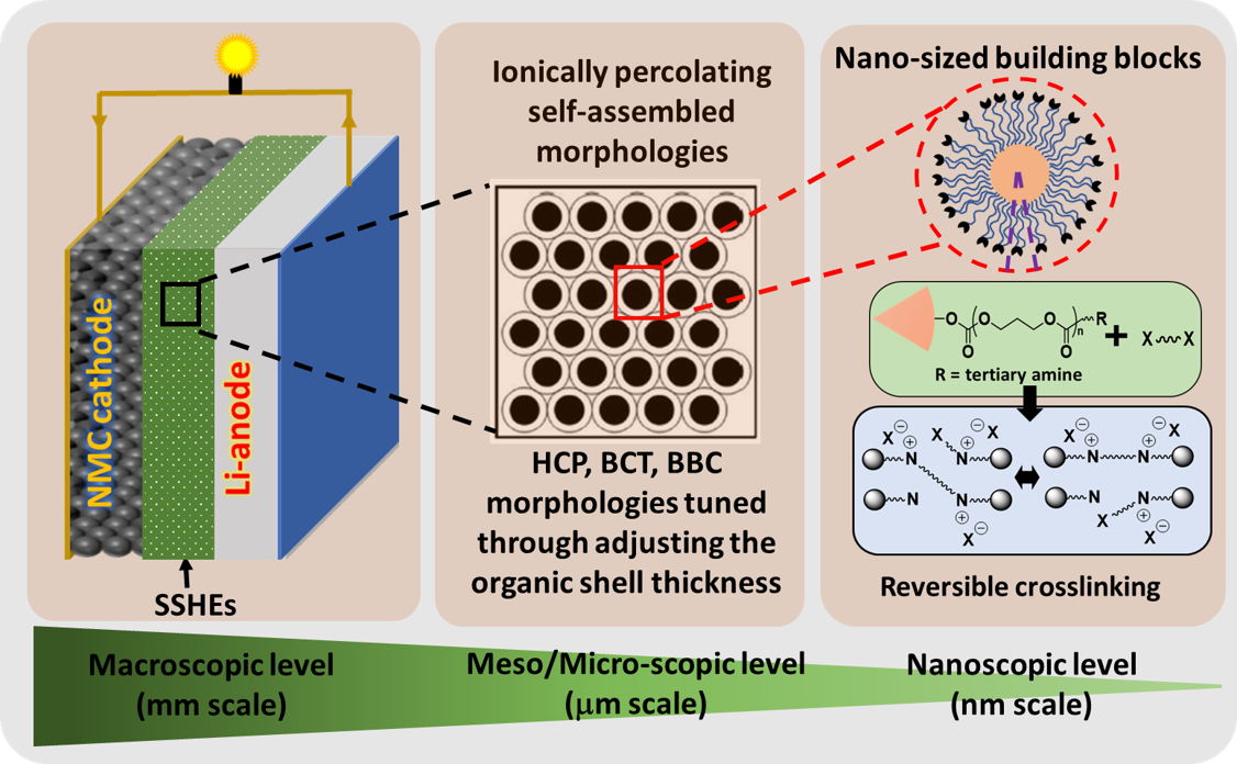 A key aspect of our work involved studying the structural organization through hierarchical self-assembly of low-dispersity high-nanoparticle (HNP) nanosized building blocks into prescribed nanoparticle superlattices. This approach aimed to create artificial solids featuring inherently Li+-conducting paths spanning nano to meso to microscopic scales. The minimalized structural variations considered parameters such as the inorganic core diameter, thickness of the ionically conducting polymeric shell, and variation of lithium salt loadings.