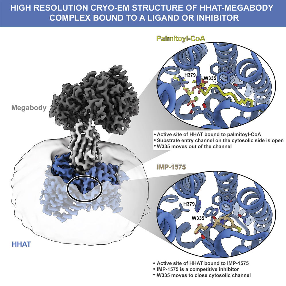 - Cry-EM strtuctures of eight compounds bound to HHAT were solved at high resolution. This has enabled structure based drug design.