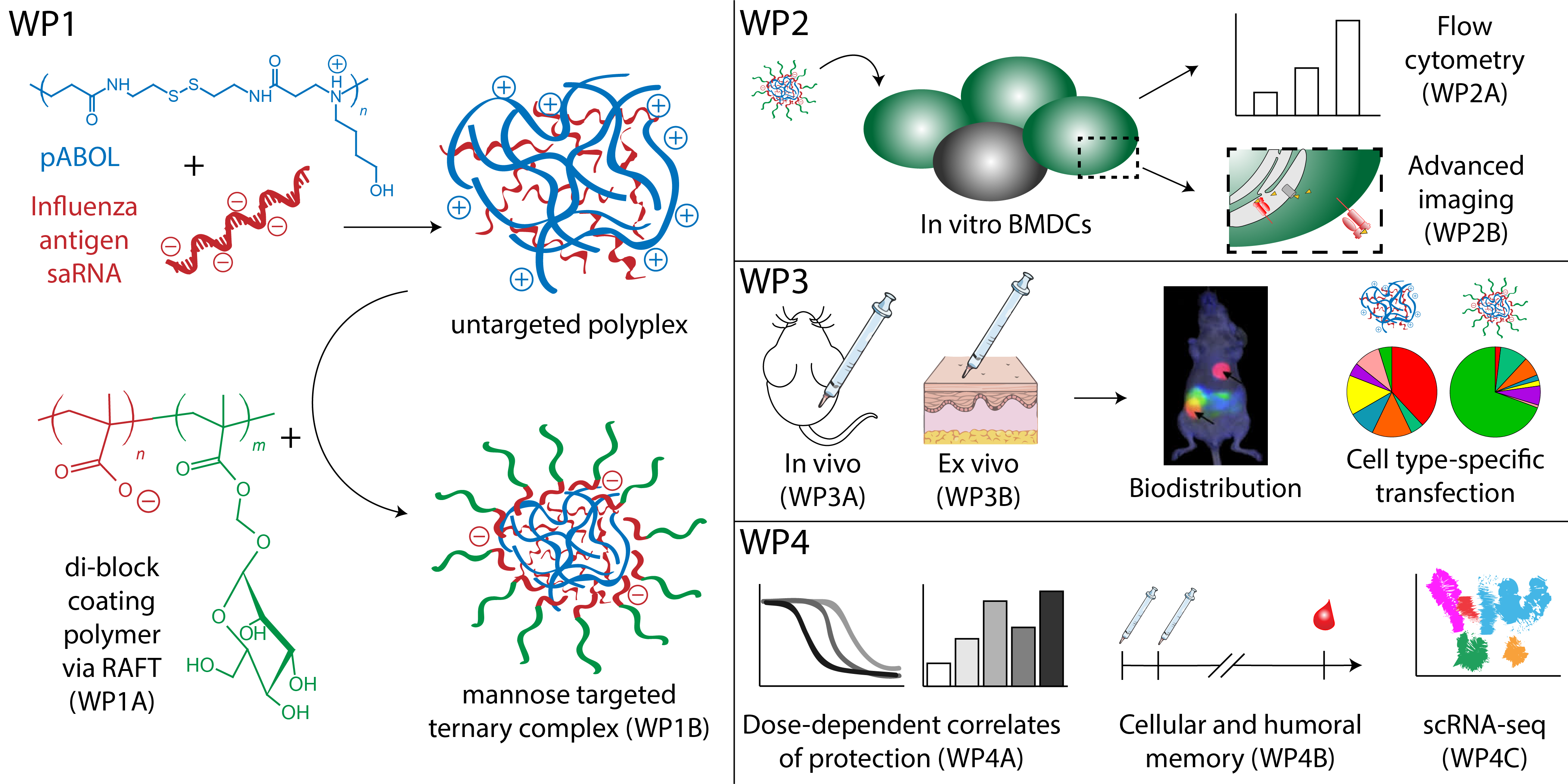 In WP2-3, we critically evaluated whether our engineered TCNs were able to target saRNA to APCs in a series of increasingly complex biological environments. Only our lead cloaking polymer prevented non-specific polyplex uptake in cultured cell lines, confirming that an optimal amount of PEG and hydrophobicity are needed to enable ligand-directed uptake. We demonstrated that mannose on the surface of TCNs increased uptake and transfection in APCs, both in simple 2D cultures and in a microfluidic lymph node co-culture model. Transfection in primary tissue explant cultures revealed that the densely negatively charged extracellular matrix composition of human skin inhibits TCNs but not LNPs. Finally, our ongoing work related to WP3-4 investigates the biodistribution and immunogenicity of intramuscularly injected mannose-cloaked TCNs with and without adjuvants in mice.