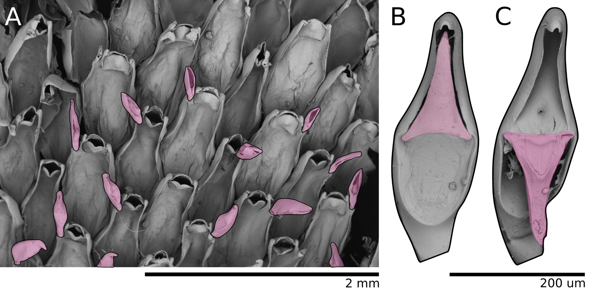 Figure 1: Example cheilostome bryozoan colony. A: colony surface, showing colony individuals and avicularia (pink). B-C: Avicularia with closed (B) and open (C) mandibles.