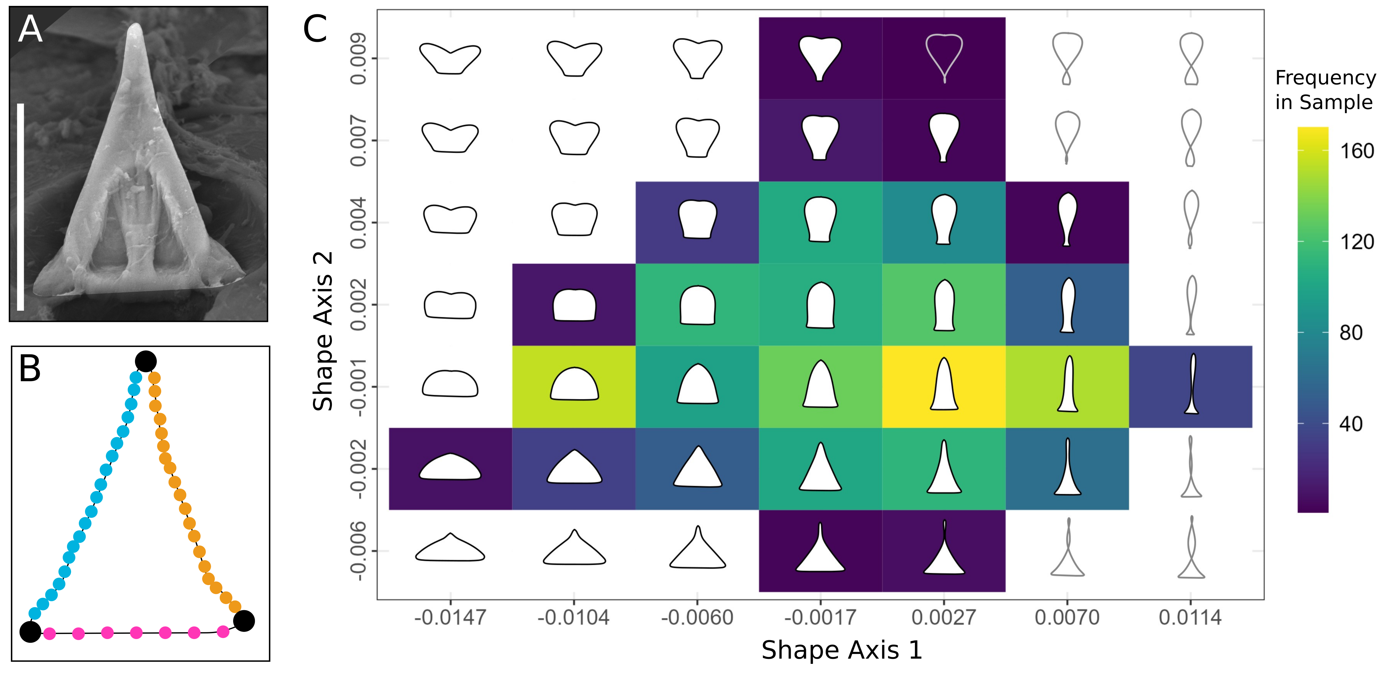 Figure 3: Measuring avicularium shape. A: mandible (scalebar: 30 um). B: Landmarks (black circles) and outline points (colored circles) used in the analysis. C: the resulting shape-space, showing how frequently each shape is found in the sample.