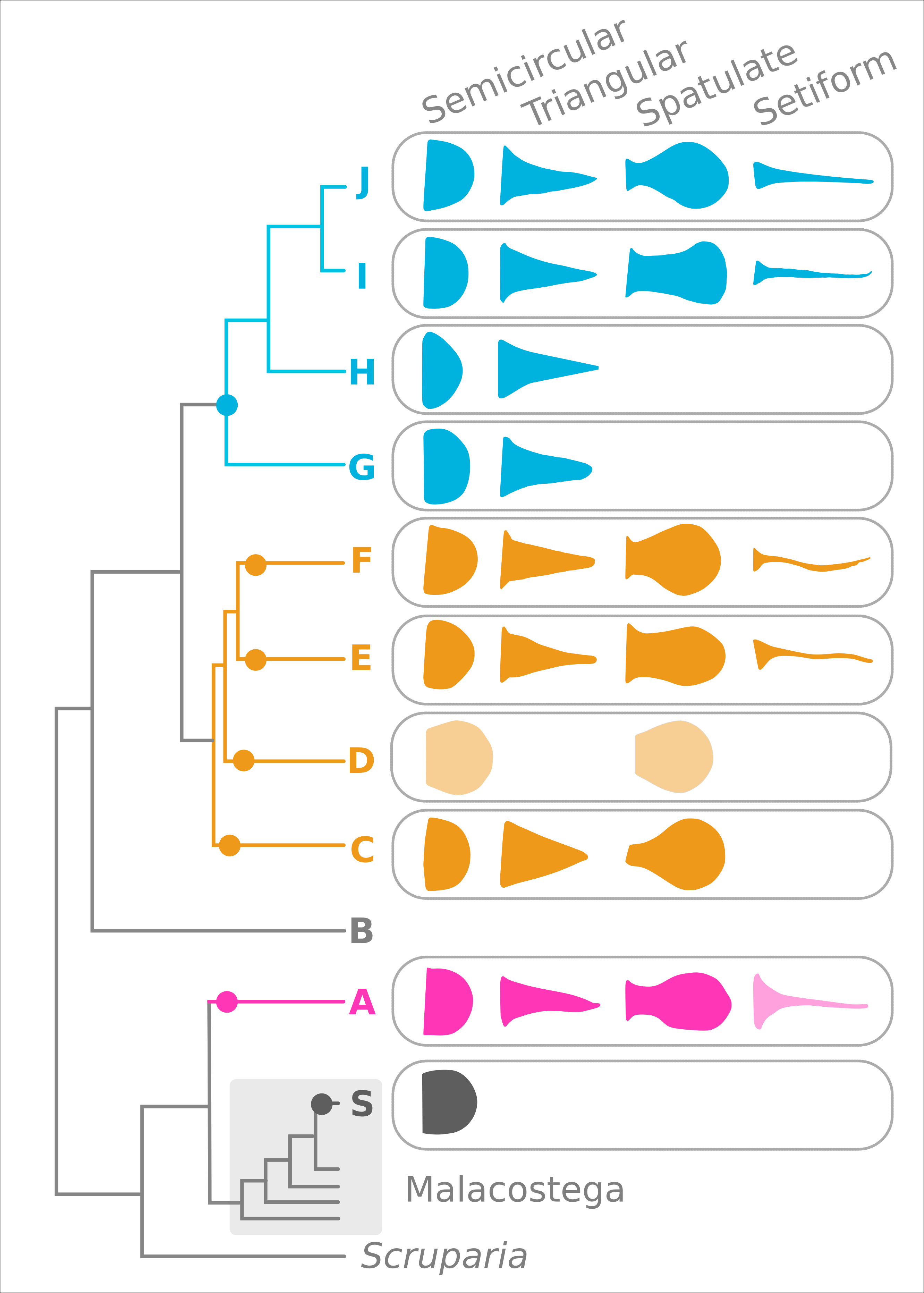 Figure 2: Cheilostome phylogeny (modified from [7]), showing independent evolutions of avicularia (circles) and convergent morphologies (silhouettes).
