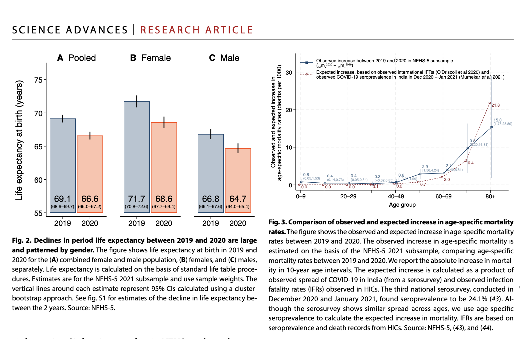 Work already published consists of the paper, “Large and unequal life expectancy declines during the COVID-19 pandemic in India in 2020”, which came out in the journal Science Advances in early 2024. The paper was widely covered in both international and Indian media and generated a lot of commentary. According to altmetric, the paper was in the top 5% of all outputs scored by altmetric, and picked up by as many as 41 news outlets. The paper was also presented at Nuffield college, University of Oxford; annual meeting of the Population Association of America (2023); and New York University Abu Dhabi. The paper documents that data from the demographic and health surveys in India measured mortality reliably – baseline age-specific mortality in 2019 in the DHS was similar to overall levels according to the United Nations Population Division’s World Population Prospects. Substantively, the paper found large declines in life expectancy in India between 2019 and 2020, suggesting that the pandemic had substantial impacts on mortality even before the deadlier second wave of COVID-19 driven by the delta variant in 2021. The project also found unequal impacts – declines in life expectancy among females were larger than declines among men, and declines among marginalized social groups of Indian society were larger than among more privileged social groups. Finally, the project helped establish that infection-fatality ratio from COVID-19 can be higher in LMIC settings than those observed in high income countries. Other work performed during the project and currently under review includes papers on maternal mortality estimation in India and the risk of mortality associated with widowhood. This work was also presented at scientific conferences, including at the European Population Conference 2024.