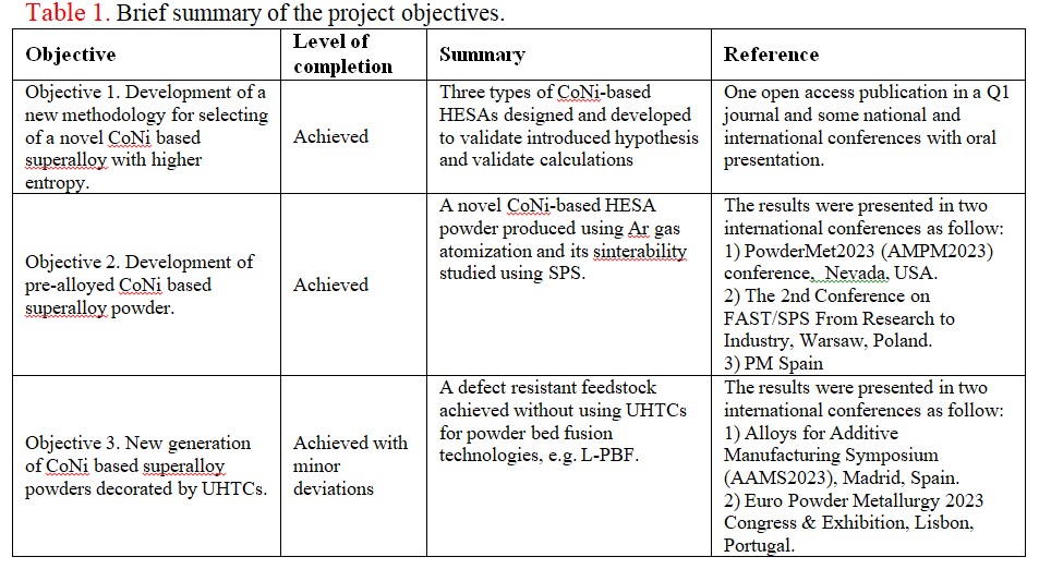 • Achievement of project objectives outlined in Table 1, including the development of a high γ' CoNi-based HESA powder feedstock for AM.