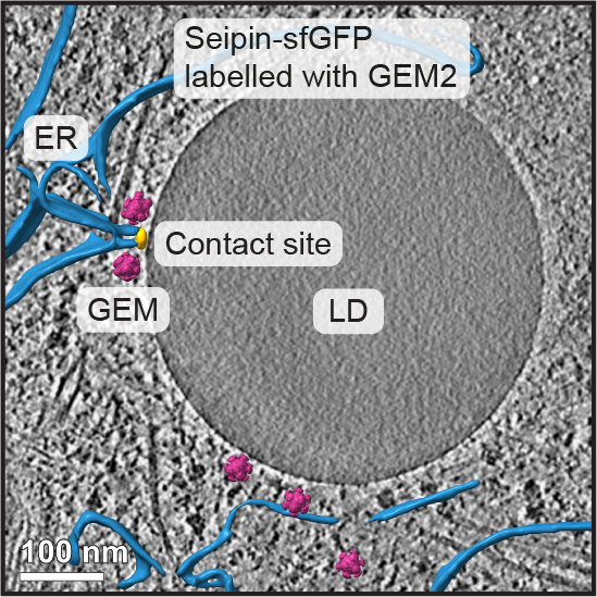 To be able to image LD formation inside cells using cryo-electron microscopy, I further co-developed new technologies allowing to localise specific molecules inside cells with high precision. We leveraged the fact that specific bacterial-derived protein assemblies have recognisable shapes, and by conditionally expressing and tethering such assemblies to our target proteins in human cells, we can thus localise these proteins inside cryo-electron tomograms with high precision. This technology has great potential in helping other researchers aiming to observe dynamic or rare events using cryo-electron tomography.