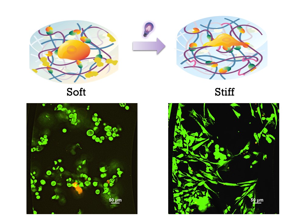 In this project, we synthesized new photo-responsive and switchable polymers using coumarin chemistry as reversible cross-linkers. Both natural and synthetic polymers were functionalized successfully with the photo-chrome. Their photo-responsiveness was corroborated by spectroscopic techniques. Furthermore, we developed novel double network hydrogels that are able to change, and also switch, their mechanical properties. The double network design allowed for modulating the mechanical and photo-responsiveness properties. Changing the mechanical properties of the cell microenvironment during culture-directed changes in cell morphology, adhesion, and proliferation. Definitively, the mechanical-instructive photo-responsive hydrogels developed thanks to this granted project represent very promising platform to investigate dynamic mechanical cues. Furthermore, the outcomes of this project further impact on Good Health and Well-being (n°3, UN sustainable development goal), contributing to create biomaterials promising for addressing the global tissue/organ demand.