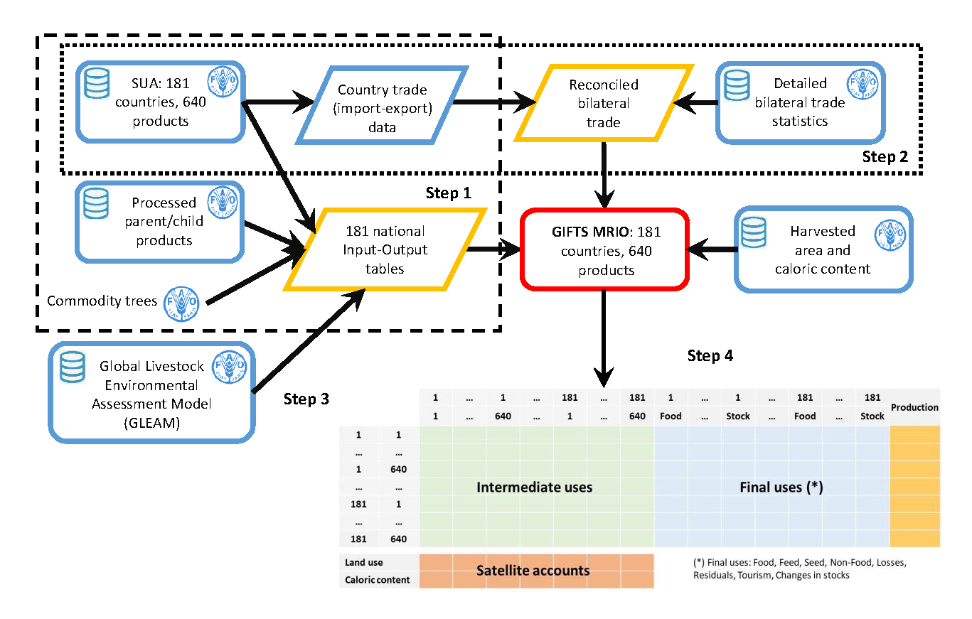 A major contribution made by GIFTS through its secondment in FAO has been to develop a module that links feed demand in the SUAs to the specific animal production sectors in the MRIO table. This is based on average feed rations per animal head from FAO's model GLEAM, which consider optimal energy requirements and the diversity of livestock systems per country. Feed items like crops and by-products were categorized and matched with those in the SUAs. The process calculates the share of each feed category relative to total demand, taking into account livestock numbers over time. The total feed demand is distributed among animal groups and linked to the animal-derived products, ensuring the full representation of meat and dairy supply chains in the MRIO database. Finally, environmental extensions were implemented, including data on cropland areas, caloric and protein content, and greenhouse gas emissions linked to crop and livestock production. These cover life cycle emission sources, such as fertilizer application, crop residue burning, manure management and application, paddy rice production, and enteric fermentation.