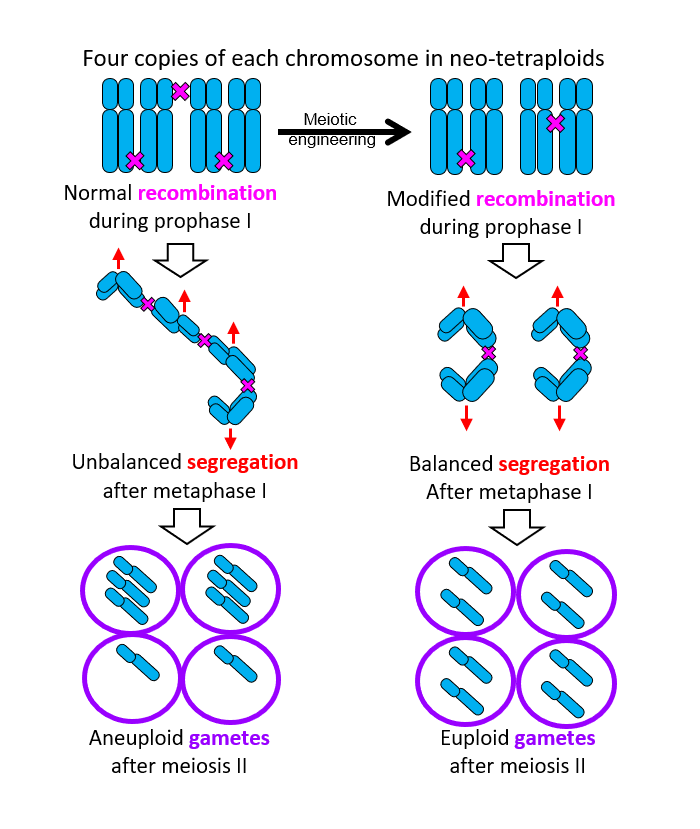 As we near the completion of this research program, once all the projects initiated have been finished the expected outcomes are twofold. Firstly, a comprehensive set of strategies will be developed to re-design meiosis in neopolyploids, making them more stable. Secondly, key insights gained from these endeavors will lay the groundwork for future, more sophisticated and comprehensive approaches to fully rescue fertility and genome stability in polyploids. The impact of these outcomes extends beyond fundamental research, with potential socio-economic implications, offering a promising solution to address some of the current global food security challenges. Successfully stabilizing neopolyploids can transform them into valuable allies in our quest for sustainable agriculture. By unlocking the full potential of these synthetic polyploids, this research contributes not only to scientific knowledge but also to practical strategies that can address the pressing needs of our growing population and changing climate.