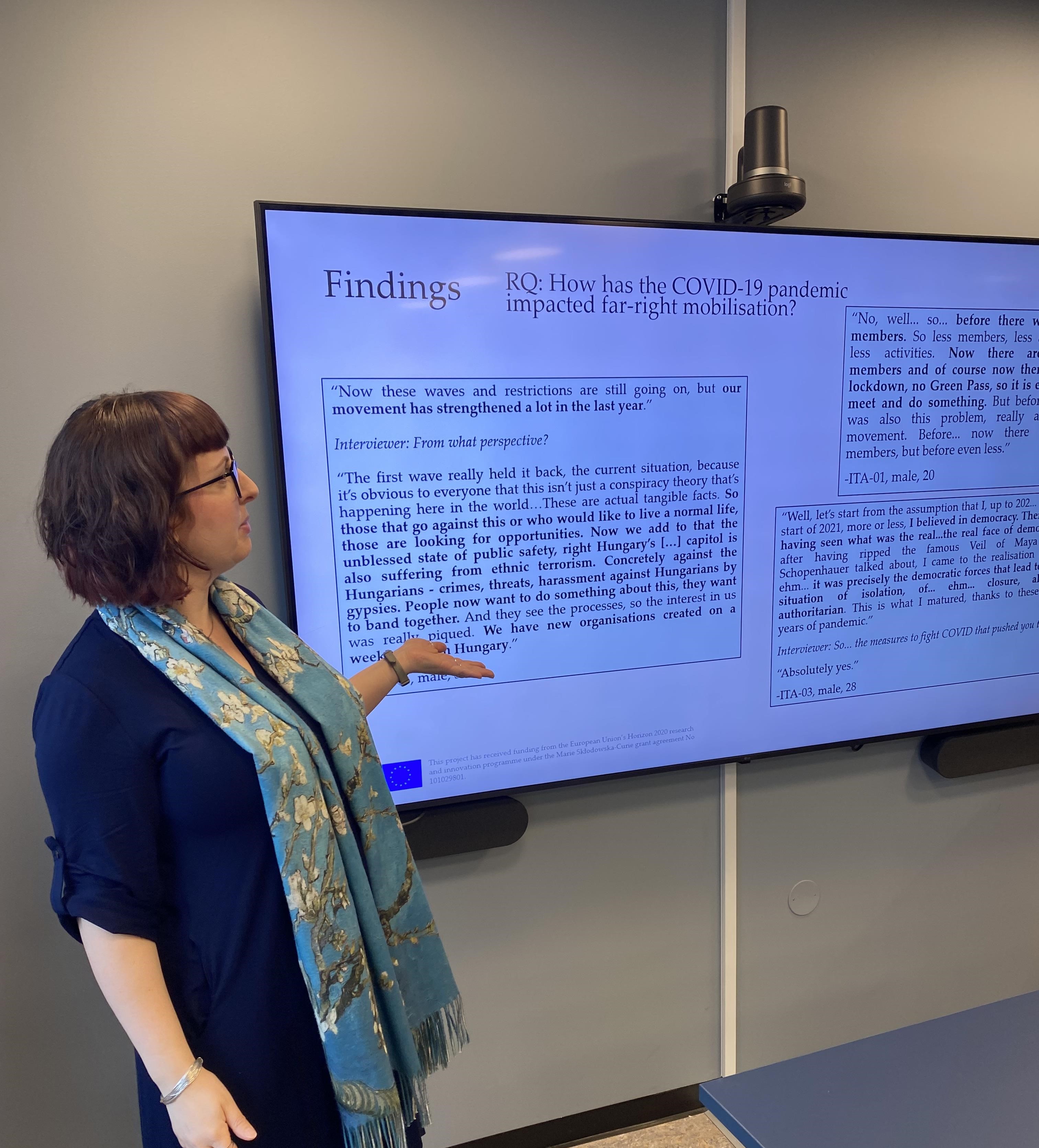 As we were conducting interviews, we realised that the questions of recruitment and enrolment were not as fruitful as originally thought, as the sample number was quite low and not enough detail was provided by participants. What we did realise, however, was that the data gave us quite a lot of qualitative evidence of belief in COVID-19 (and other) conspiracy theories by far-right extremists. Therefore, most of the dissemination of the project results focused rather on this question. Results of SODIS were disseminated at various conferences (ECPR, CPSA, ASEN, EuroCrim) and an invited lecture for the Populism and the Far Right webinar series. The project contributed to a book chapter entitled 'Building a New World Order: COVID-19, the far right, and the pervasiveness of antisemitic conspiracy theories' and to a journal article (in submission), as well as an edited volume completed during the the fellowship period (The Routledge Handbook of Far-Right Extremism in Europe).