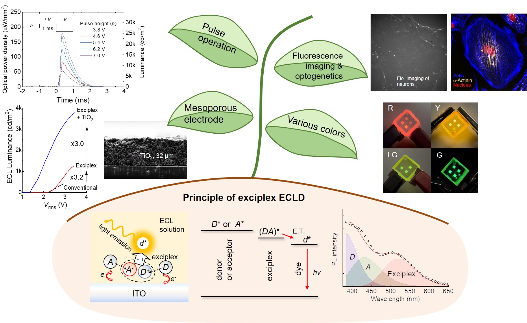 O3. Applications to stimulation of neurons in vitro and in vivo: Driving the yellow sol-LED by a biphasic voltage pulse ensured a super high brightness of 25,000 cd/m2 (or 180 mW/mm2). We summarized the energy density of photon emission per pulse by parameters of pulse heights and pulse widths. We carried out Ca2+ imaging of neurons by fluorescence microscopy in vitro. A sandwich-type sol-LED was placed underneath the neuron-cultured dish and simultaneously on top of the objective of inverted microscope. Both excitation and fluorescence light passed through the device in this microscopy. Confirming the imaging technique and emission by sol-LED sufficiently bright to activate ChRmine-expressing neurons, we are preparing an optical pacing of contraction of transgenic cardiomyocytes expressing ChRmine using the light emission by sol-LED and simultaneous observation of the contraction by microscope.