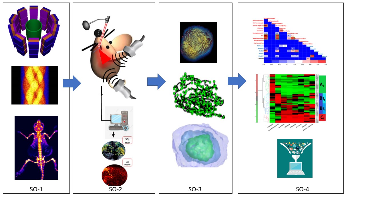 The OCTOPUS (Oncological Concurrent Tomographic Optoacoustics, Pet and UltraSonography) project aimed to create a new multimodal imaging tool to correlate molecular, vascular and tissue oxygenation information, three of the main hallmarks of cancer, in a longitudinal, simultaneous, quantitative, fully co-registered and in vivo manner. Because cancer is a complex disease involving multiple hallmarks, many of the recently developed therapies, described as precision medicine, target these hallmarks. Imaging techniques are crucial tools for analysing the stage, characteristics, and relationship between several of these hallmarks. However, until recently these analyses were performed from separate imaging modalities, taken at different physiological states, making multiparametric correlation difficult. The OCTOPUS project will build the first in vivo and multimodal preclinical tool that investigates simultaneously the interactions between tissue oxygenation by Multispectral Optoacoustic Imaging, vascularization by Ultrafast Ultrasound Imaging, and Metabolism, employing super-resolved PET imaging. OCTOPUS will also provide a machine learning-based platform for advanced multi-parametric analysis of all image-derived tissue features that can be extracted with this equipment, in order to facilitate the interpretation of underlying tumoral mechanisms and ultimately guide the design or tailoring of targeted therapies.