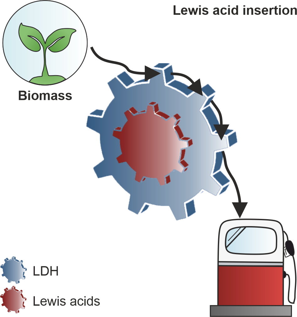 The project focuses on the catalytic valorisation of two major biomass components, specifically ketones and aldehydes. For this purpose, two new synthesis strategies for surface-modified LDH with LA considered as active catalysts for these reactions were designed and developed. Using these methods, the incorporation of LA could be realized such a way that LA cations are isomorphously incorporated into the framework of LDH and replace the Al(III) framework cations. By systematically changing the reaction conditions (reaction temperature, reaction time, initial concentrations, etc.), stable, phase-pure multifunctional catalysts with remarkable Lewis acidity and (Brønsted) basicity and well-regulated morphology were synthesized. All the obtained structures were tested in catalytic test reactions, especially aldol condensation and transfer hydrogenation (MPV) reactions. These catalytic reactions are suitable to convert the above-noticed biomass components into more valuable products such as alcohols (MPVO). Each candidate catalyst showed catalytic activity in both test reactions. Their activity could be attributed to the quality of the LA centres. The observed differences in the catalytic performance of the catalyst candidates allowed the selection of the most promising ones, including Ce(IV)- and Sn(IV)-active LA components. By fine-tuning the reaction conditions of the aldol and MPVO reactions promoted by these catalysts, remarkable increases in the conversion of the reactants can be achieved with unchanged, unique selectivities toward the desired products. Moreover, the presented catalysts enabled these reactions under mild reaction conditions, especially at lower temperatures compared to the benchmark catalysts.