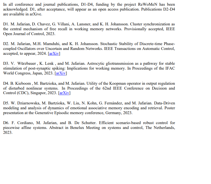 The first task, ‘Control-theory based analysis of the model in WP1’, was performed by control-theory based network synchronization analysis of the biological modular model of the WM, nonlinear stability analysis of the learning dynamics, as well as stochastic stability of a general and abstract model of neuronal networks.