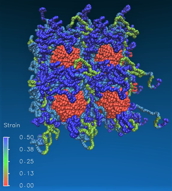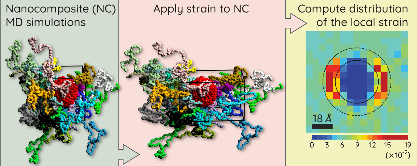 As graphene is a potential candidate to notably enhance the overall mechanical performance of PNCs, the fellow investigated the mechanical properties of graphene via a hierarchical multiscale approach, combining atomistic simulations and continuum mechanics. Furthermore, he studied the origin of the mechanism of the mechanical reinforcement and the importance of the adsorbed (train) segments at the low-loading regime and of the bridges at the high-loading one. He also found that the mechanical moduli of the matrix region increase non-linearly with volume fraction of nanofiller, unlike the mechanical properties of the interphase region which remain constant. The origin of the mechanical reinforcement in PNCs is attributed to the heterogeneous chain conformations at the vicinity of the NPs, involving a two-fold mechanism. In the low-loading regime, the reinforcement comes mainly from a thin, single-molecule, 2D-like layer of adsorbed (train) polymer segments on the NP, whereas in the high-loading regime, the reinforcement is dominated by the coupling between train and bridge conformations, which involve segments connecting neighboring nanoparticles.
