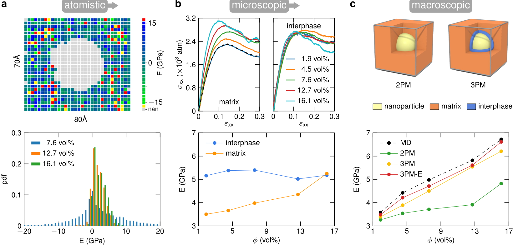 Moreover, the fellow has developed a methodology starting from detailed atomistic MD simulations of the interphase in order to construct a strain gradient continuum theory of initially the polymer/NP interphase and subsequently of the entire PNC, at the level of the repetitive unit cell. To reach this objective, he obtains the spatial distribution of the mechanical properties of the PNC, including the local hyperstress and gradient field distributions through atomistic MD simulations. From these, we identify a strain gradient constitutive law for the polymer/NP interphase region which then informs the development of a strain gradient homogenized theory for PNCs based on a local strain gradient interphase model.