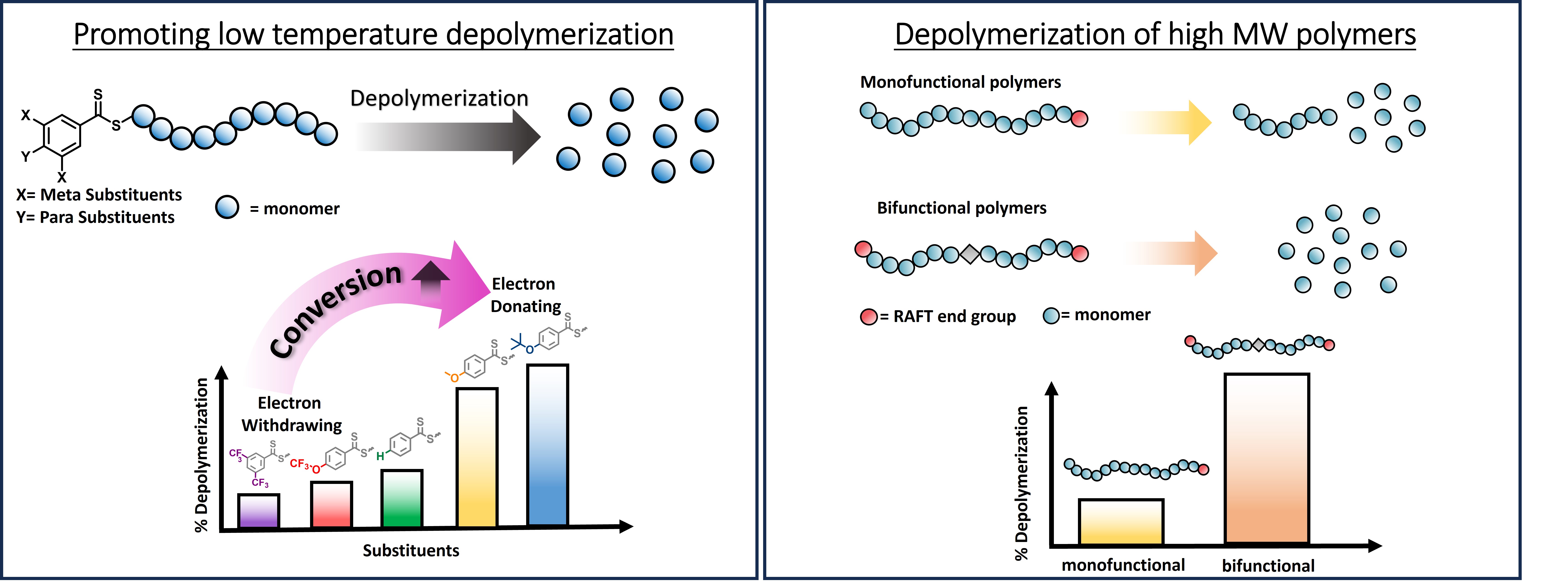 In WP1, we synthesized RAFT agents with various substitutions to control their activities. The enhancement of electron density of these RAFT agents enabled the polymers to depolymerize at lower temperatures (90 °C) than reported in the literature (120 °C). Five different substitutions were employed to study both the enhancement and decrement effects on depolymerization. Polymers containing the RAFT agent with the lowest electron density exhibited a slower depolymerization at lower temperatures and a lower yield (~20%) of depolymerization. Conversely, the enhancement of electron density of the RAFT agent facilitated a higher rate of depolymerization, with yields closer to 80%. These substitutions highlight the fact that depolymerization can be facilitated without using any catalyst by simply altering the electron densities of the RAFT agents. Furthermore, calculations demonstrated that the enhanced electron density of the RAFT agents facilitated faster C-S bond scission between the RAFT agent and the polymer, ultimately resulting in faster and higher yield depolymerization. To date, the project results have been shared in conferences, and the main manuscript is nearing completion for publication.