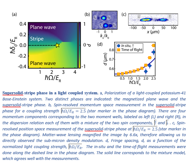The objectives of this project were: (1) to create a supersolid in a spin-orbit coupled Bose-Einstein condensate and explore its properties. (2) to unite the characteristics of the novel supersolid with a quantum droplet, an exotic system stabilized from collapse by quantum fluctuations, to investigate a never seen phase: the supersolid-striped droplet.