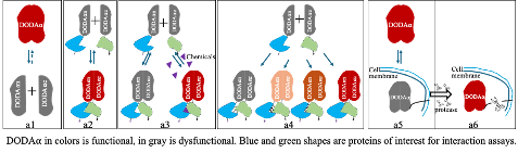2) use split DODA⍺ in testing protein-protein interaction as an alternative to the widely used split fluorescent protein (BiFC) or luciferase (FLCA) systems;