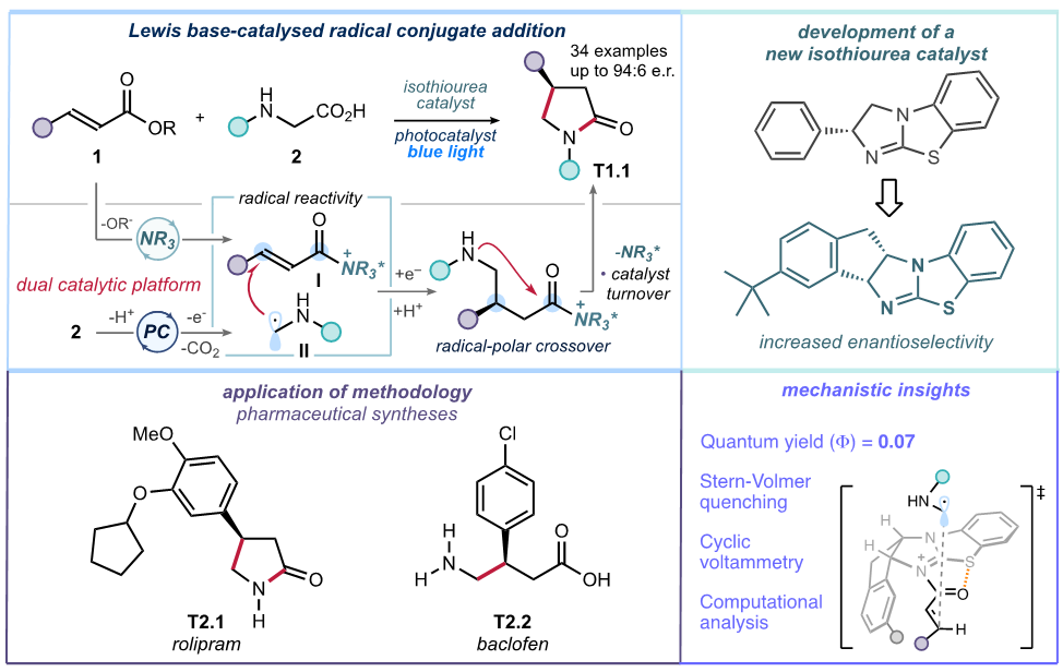 This was realized by combining isothiourea catalysts with photoredox catalysis, which has enabled the construction of complex chiral molecules from readily available and cheap starting materials. New isothiourea catalysts were developed and used in this technology alongside organic, metal-free photoredox catalysts, which constitutes a sustainable method which has been shown to be useful for making biologically relevant molecules.